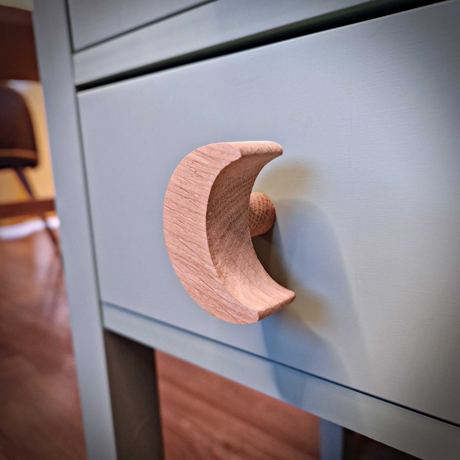 Drewniana gałka do mebli w kształcie księżyca to subtelny i przytulny akcent, który doskonale sprawdzi się w pokojach dziecięcych, sypialniach czy kącikach wypoczynkowych. Wykonana z litego drewna dębowego, starannie wyszlifowana i pokryta bezbarwnym, ekologicznym olejem, łączy naturalne piękno z prostym, ponadczasowym designem.
