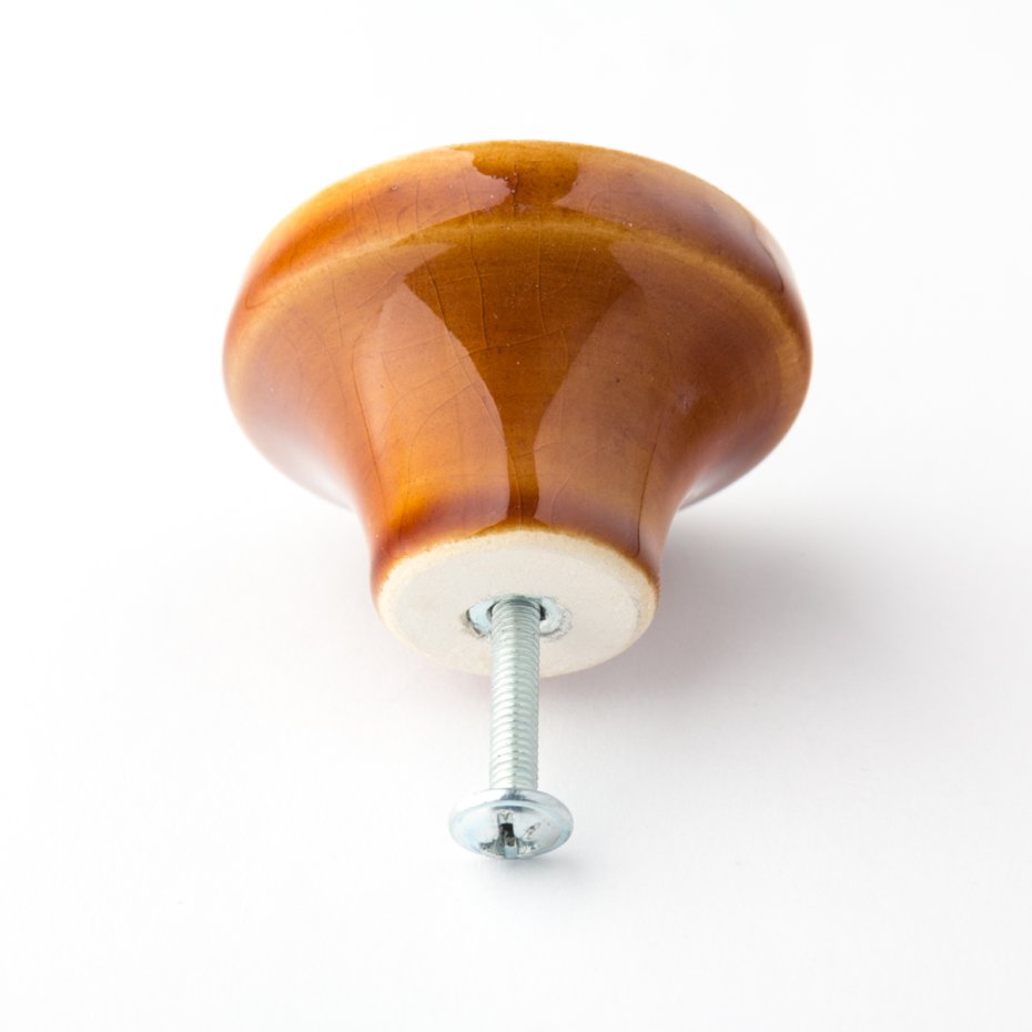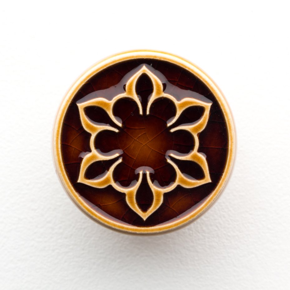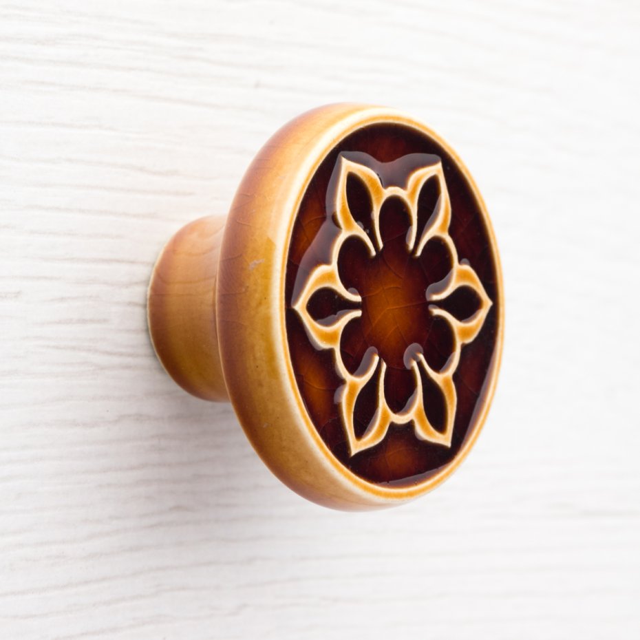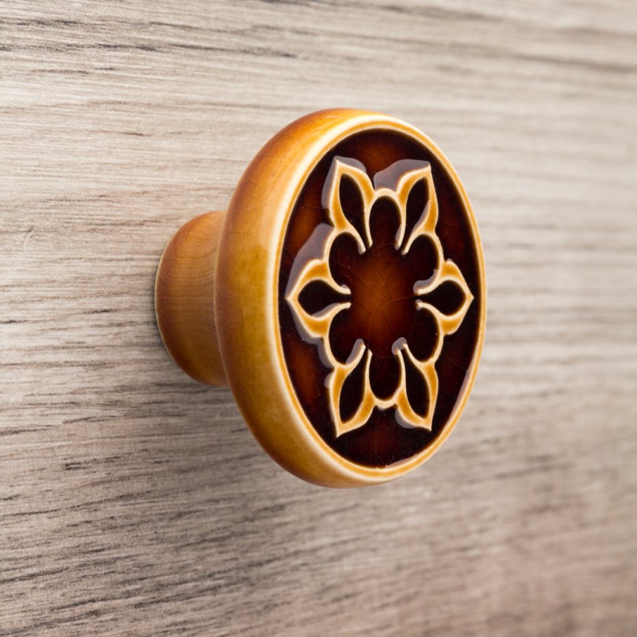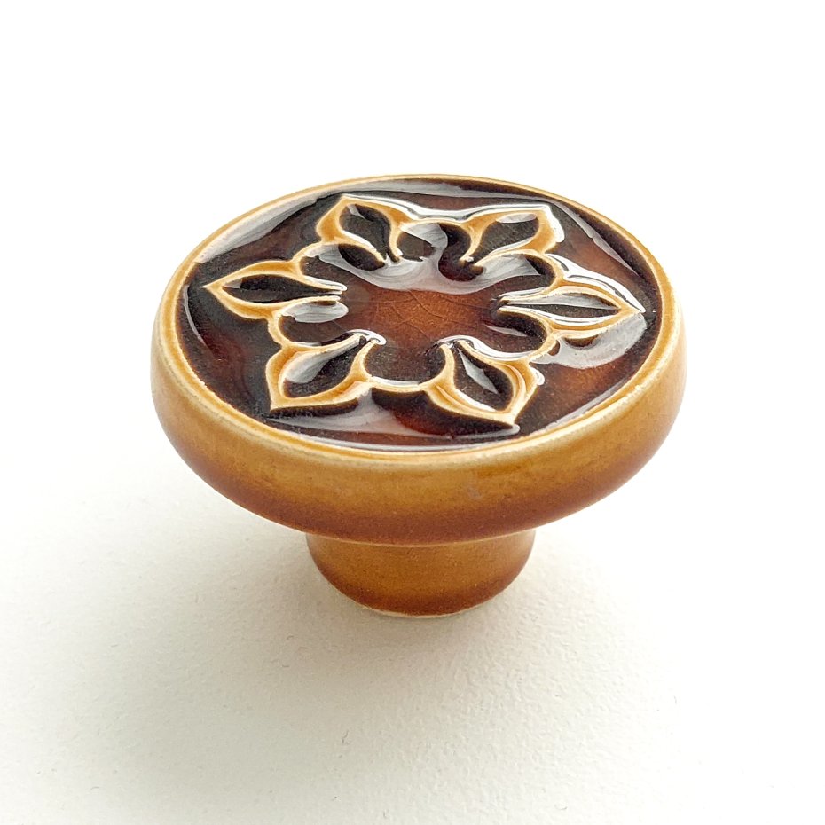 Ceramiczna gałka do mebli – ręcznie wykonana, ornamentowa, wg własnego projektu. Wykonana z jasnej gliny, pokryta błyszczącym szkliwem.