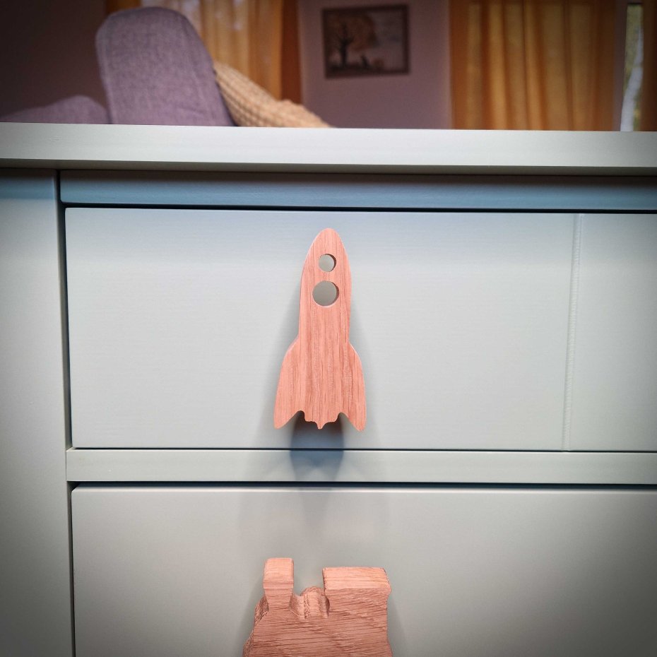 Drewniana gałka do mebli w kształcie rakiety to wyjątkowy dodatek do pokoju małego odkrywcy i fana kosmosu! Wykonana z litego drewna dębowego, starannie szlifowana i pokryta naturalnym, ekologicznym olejem, łączy w sobie prostotę, funkcjonalność i niepowtarzalny urok naturalnego materiału.