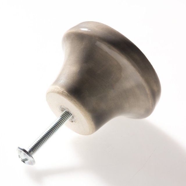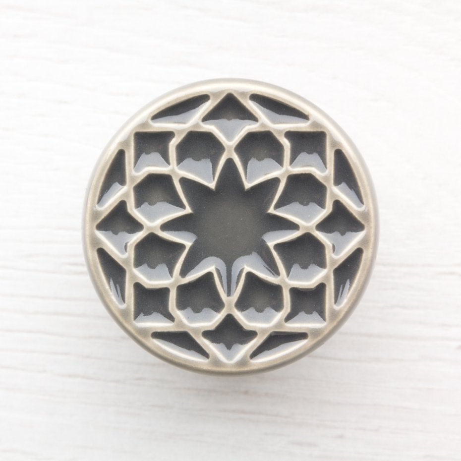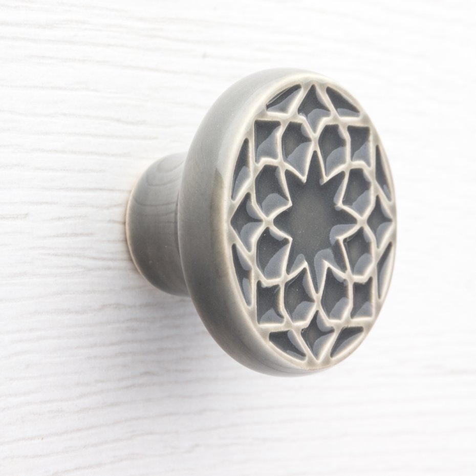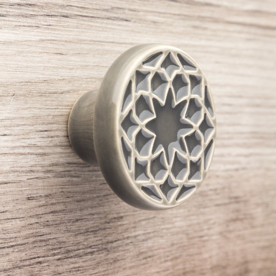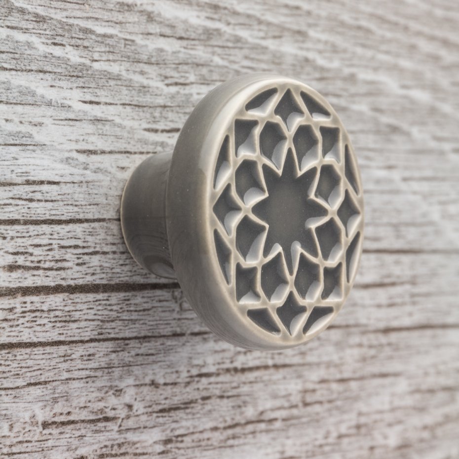 Ceramiczna gałka do mebli – ręcznie wykonana, ornamentowa, wg własnego projektu. Wykonana z jasnej gliny, pokryta błyszczącym szarym szkliwem.