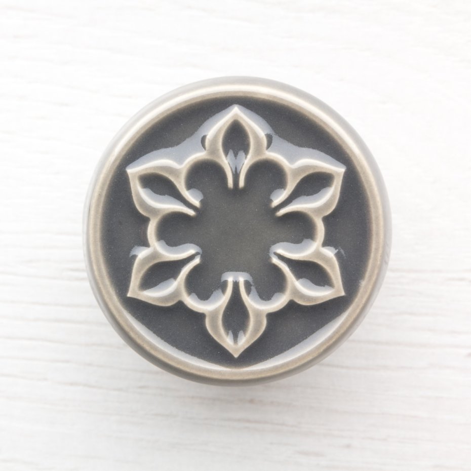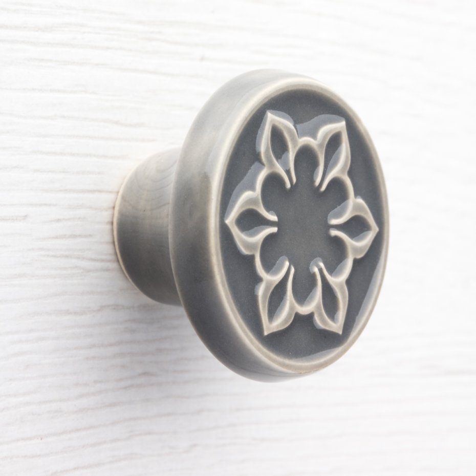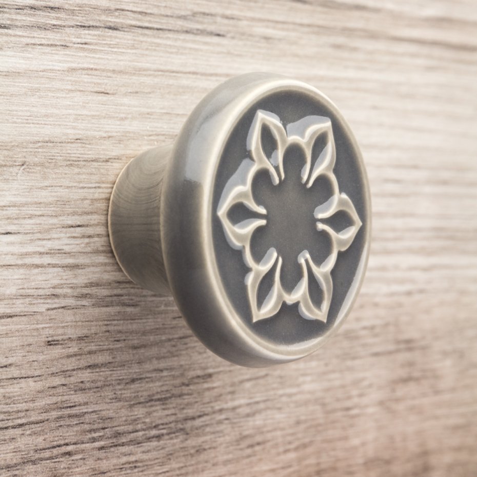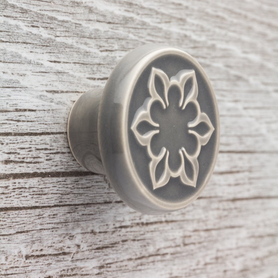 Ceramiczna gałka do mebli – ręcznie wykonana, ornamentowa, wg własnego projektu. Wykonana z jasnej gliny, pokryta błyszczącym szarym szkliwem.