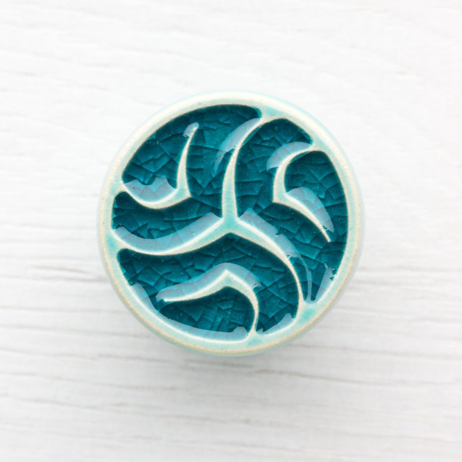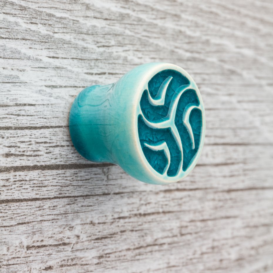 Ceramiczna gałka do mebli – ręcznie wykonana, ornamentowa, wg własnego projektu. Wykonana z jasnej gliny, pokryta błyszczącym szkliwem.