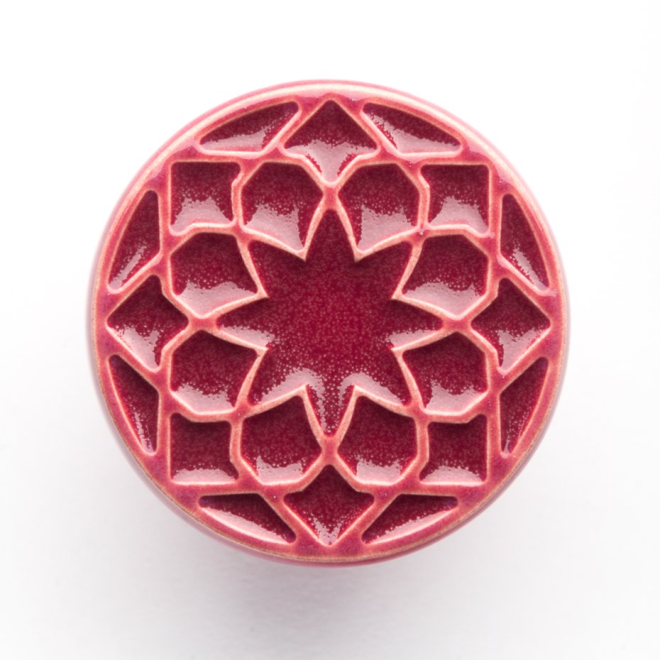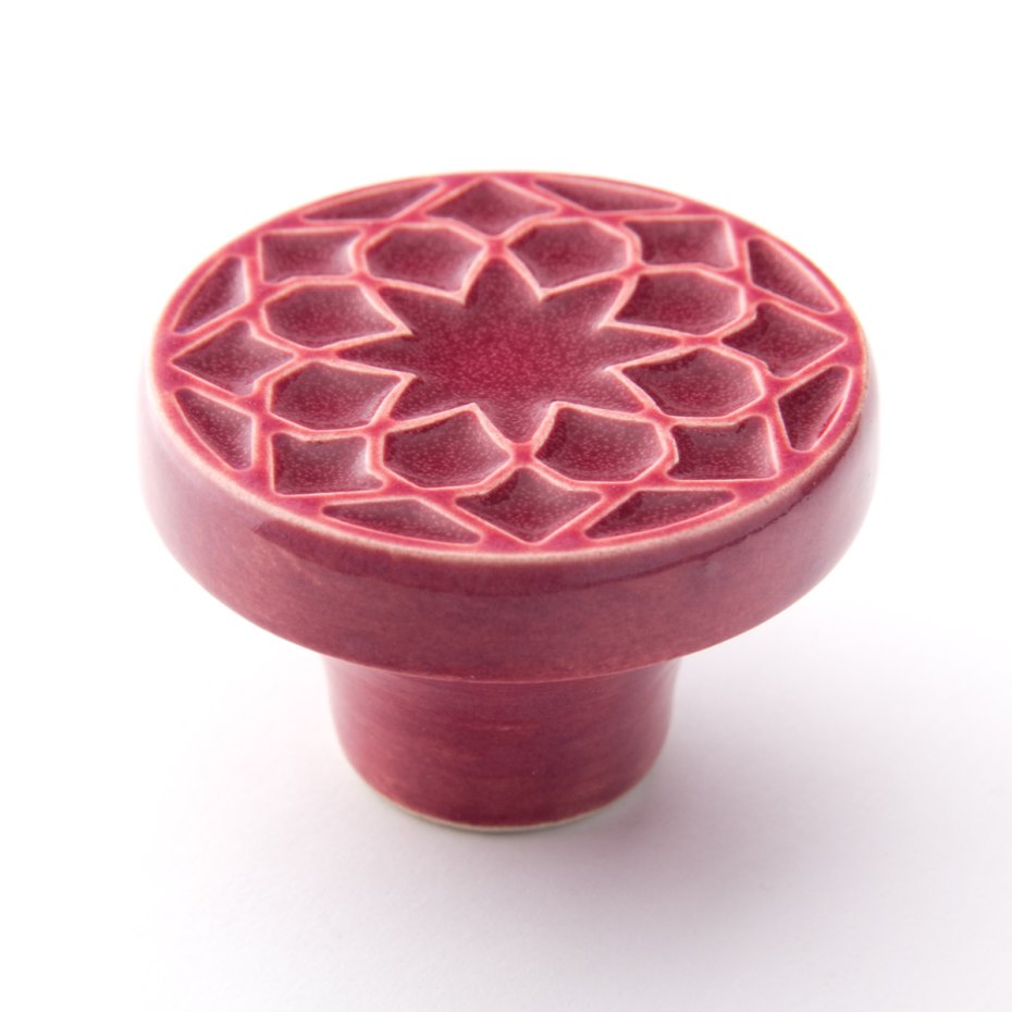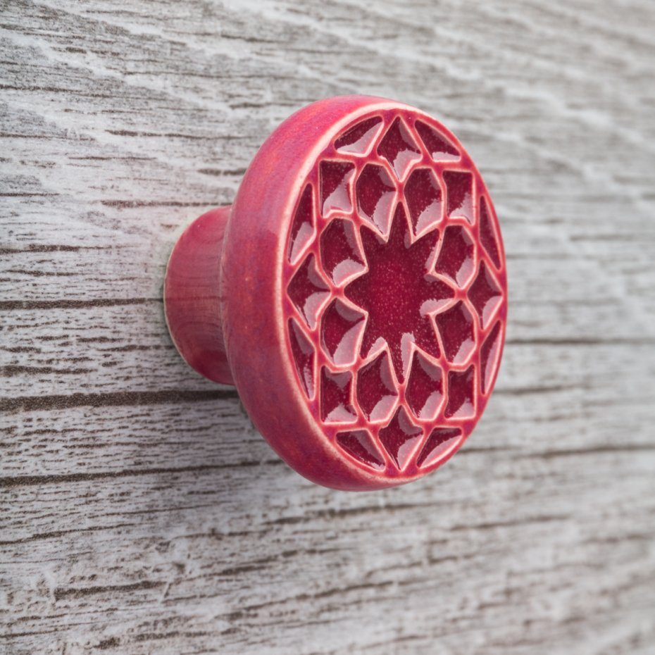 Ceramiczne gałki do mebli - ręcznie wykonane, ornamentowe, wg własnego projektu. Wykonane z jasnej gliny, pokryte błyszczącym, wiśniowym szkliwem, wypalone dwukrotnie w wysokiej temperaturze.