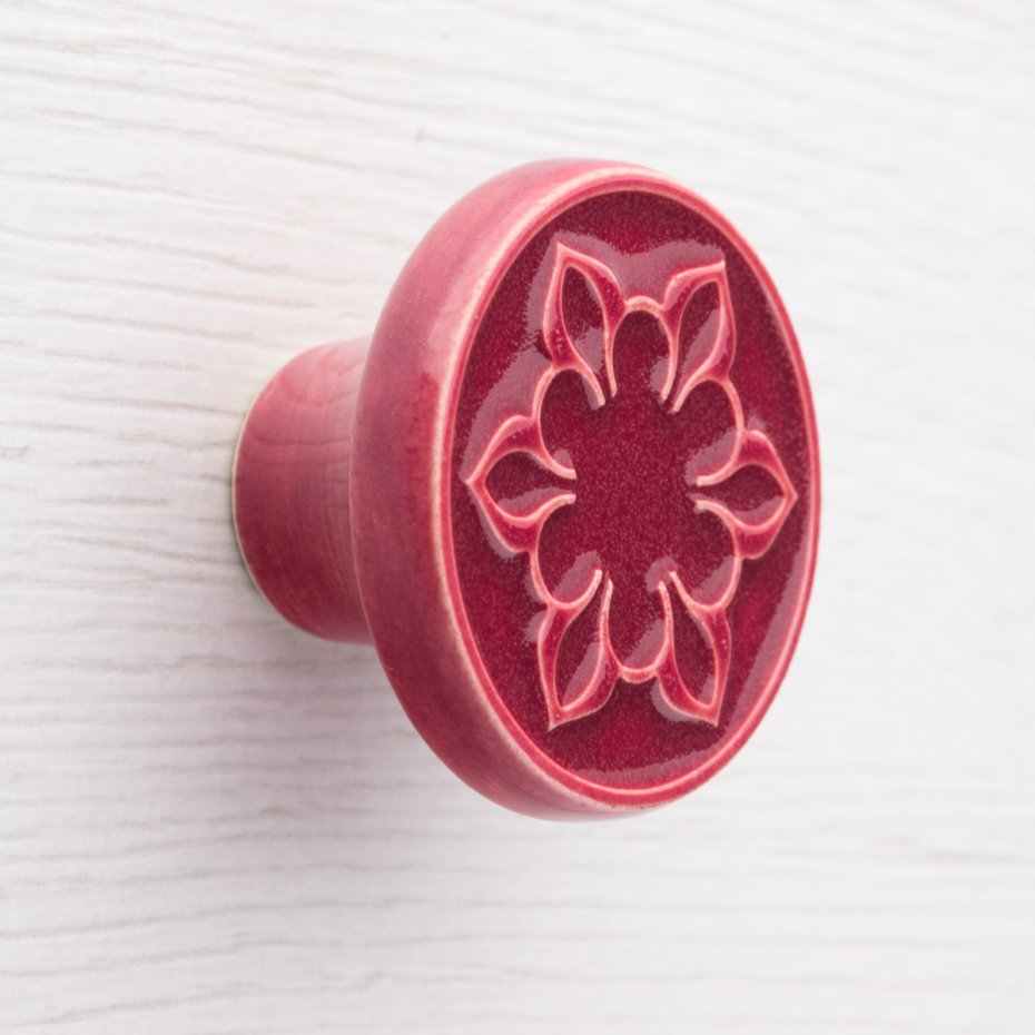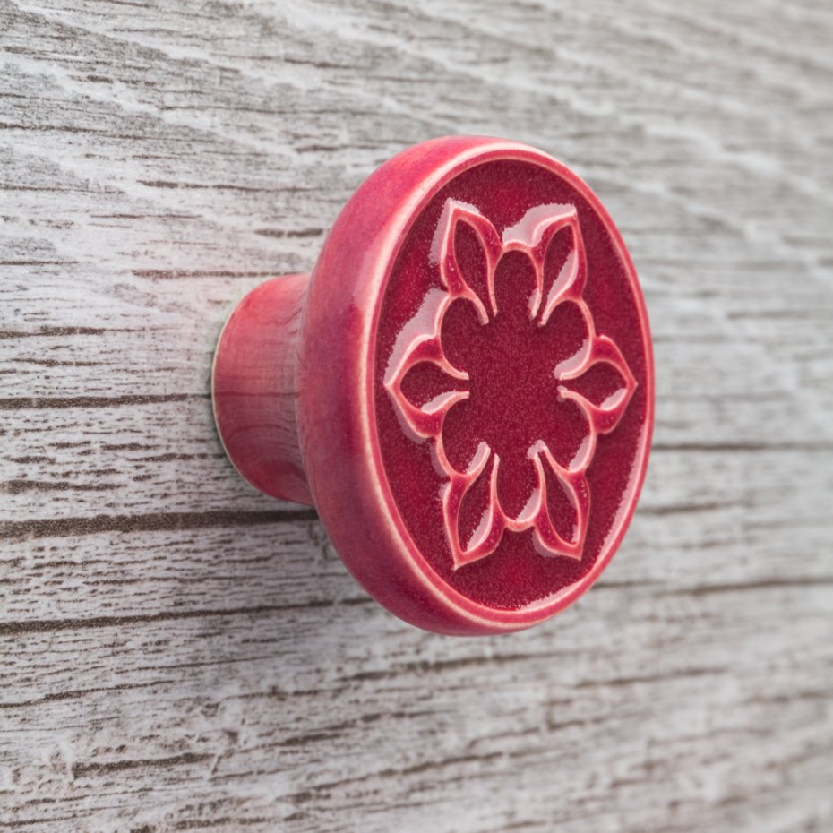 Ceramiczne gałki do mebli - ręcznie wykonane, ornamentowe, wg własnego projektu. Wykonane z jasnej gliny, pokryte błyszczącym, wiśniowym szkliwem, wypalone dwukrotnie w wysokiej temperaturze.