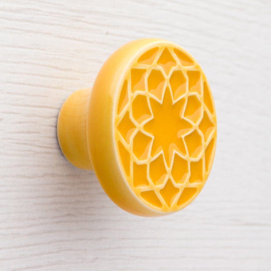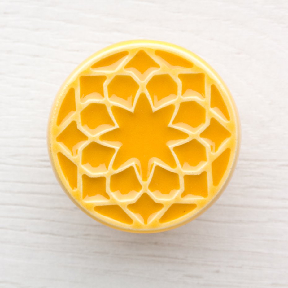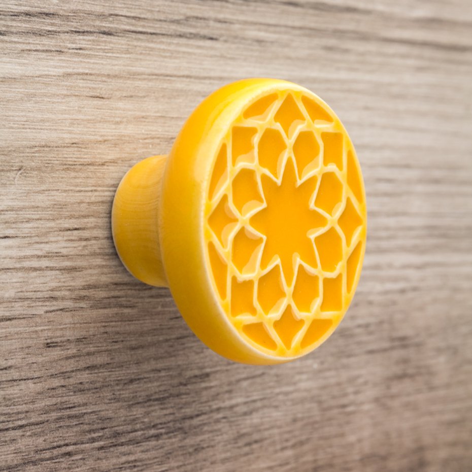 Ceramiczne gałki do mebli - ręcznie wykonane, ornamentowe, wg własnego projektu. Wykonane z jasnej gliny, pokryte błyszczącym, żółtym szkliwem, wypalone dwukrotnie w wysokiej temperaturze.