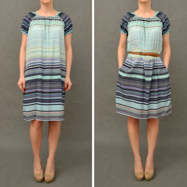 Prześliczna sukienka marki Gap. Z lejącego materiału w kolorach turkusu, który przechodzi w zieleń i fiolet. Pasiasta. Po bokach kieszonki. Dekolt i końce rękawków na gumce. Świetnie wygląda z paskiem i bez - (w wersji oryginalnej bez paska, krój luźny).