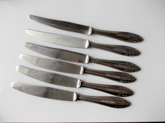 Komplet noży z napisem ,,Gastronomia''. Cztery są w stanie bardzo dobrym (do wyczyszczenia), dwa pozostałe pochodzą chyba z innego kompletu, nieznacznie się różnią i posiadają wyraźniejsze oznaki użytkowania. Nie pochodzą z second handu, a z rodzinnej kolekcji.