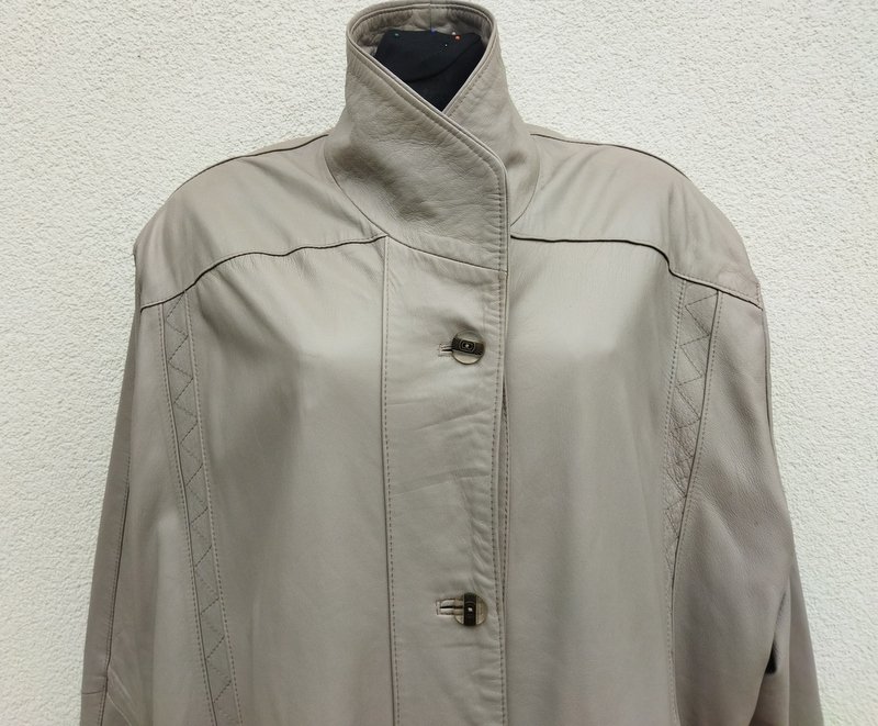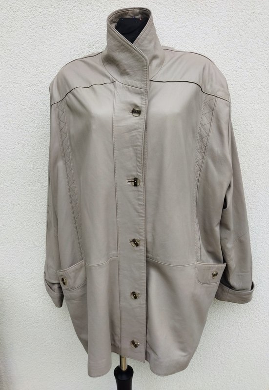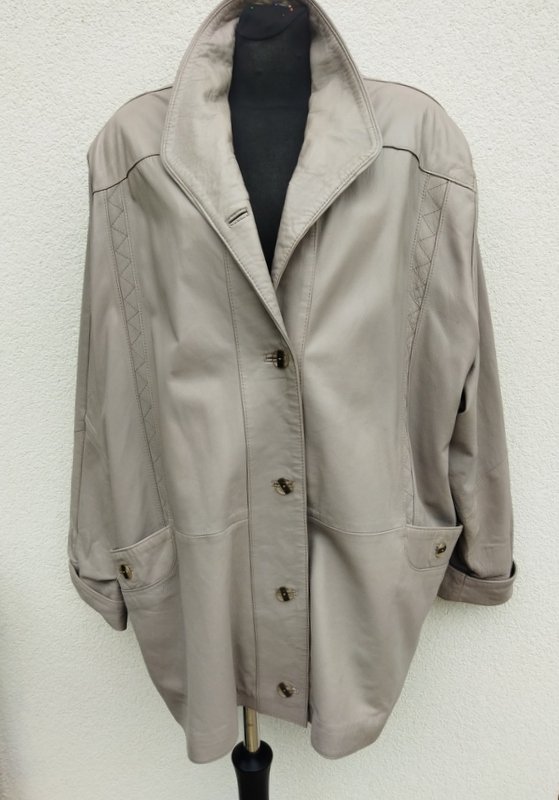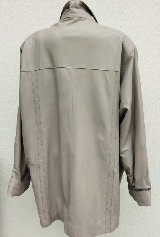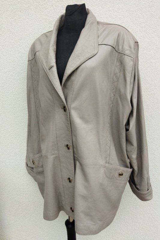 Płaszcz lub dłuższa z bardzo mięciutkiej naturalnej jagnięcej skóry licowej w piaskowym kolorze ( chłodnym beżu) z ozdobnymi przeszyciami. Swobodny krój z kołnierzem , z dwiema wpuszczanymi kieszeniami, z wywijanymi mankietami rękawów. Zapinana na eleganckie dopasowane kolorystycznie guziki. Całość na podszewce. Wygodna, mięciutka i bardzo lekka - zapewnia duży komfort w użytkowaniu. Ładniejszy w realu