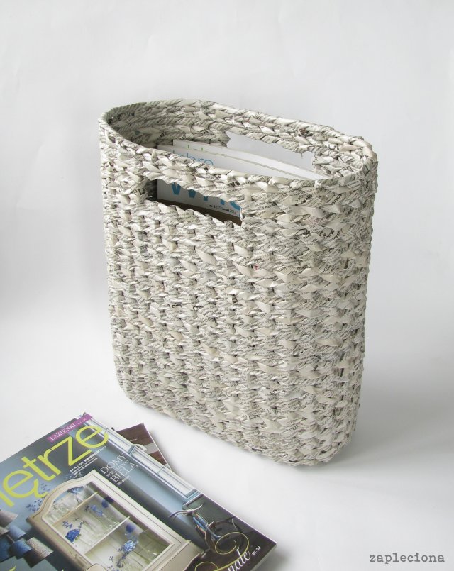 Szary gazetnik wypleciony z papieru makulaturowego. Dokładnie zabezpieczony bezbarwnym lakierem akrylowym. W razie zabrudzenia można go delikatnie przetrzeć wilgotną ściereczką. Gruby splot w jodełkę, poręczne uchwyty. Zmieści sporo gazet. Oryginalny dodatek do wnętrz. Dobry pomysł na prezent.