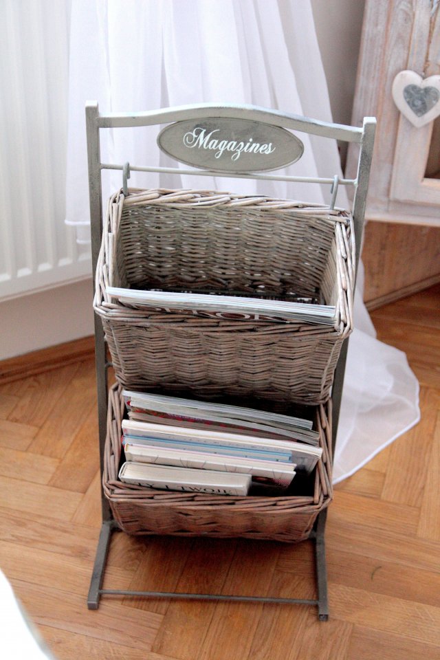 Oryginalny gazetnik na metalowym stelażu w szarym kolorze, na którym wiszą dwa wiklinowe kosze na gazety pobielone. Na górze napis Magazines.