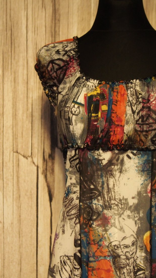 Śliczna sukienka marki Geisha. W wzorek jak uliczne graffiti. Z poliestru z dodatkiem spandexu.
