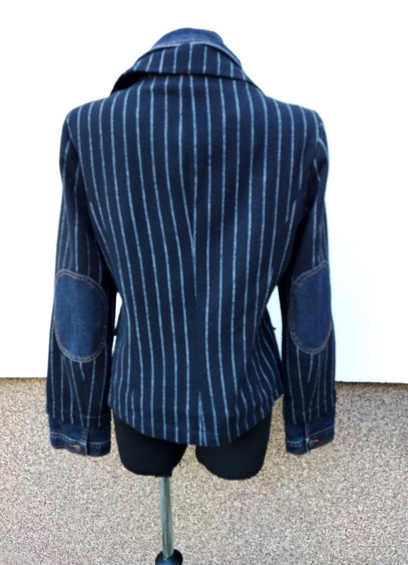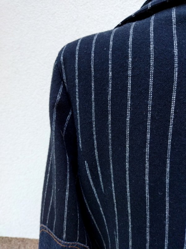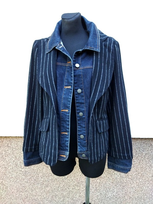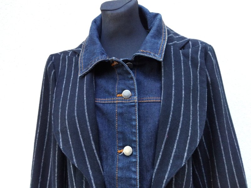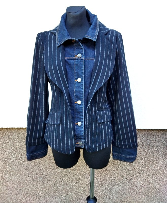 Marynarka lub kurtka z cieplejszej czarnej tkaniny w prążki w kolorze złamanej bieli z kołnierzem z rewersami , z dwiema wpuszczanymi kieszeniami z patkami, w efektownym połączeniu z jeansową tkaniną imitującą kurtkę wystająca spod marynarki - wszyta wstawka z przodu z kołnierzem i zapięciem na napowe guziki, wystające jeansowe mankiety z zapięciem na napowy guzik, łatki na łokciach - wszystkie jeansowe elementy stębnowane kontrastowymi pomarańczowymi nićmi. Taliowna . Całość na podszewce.