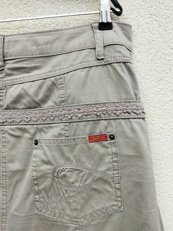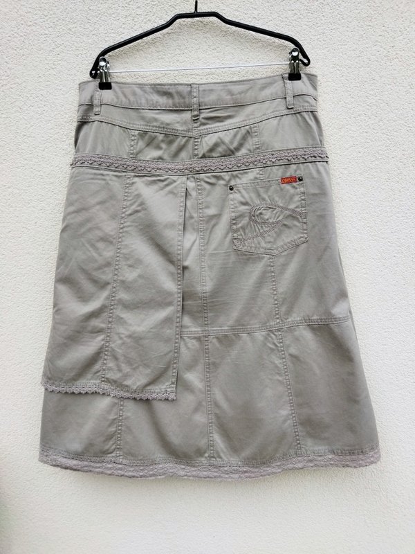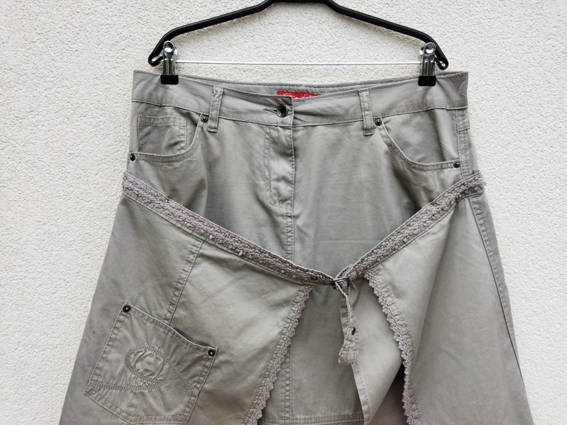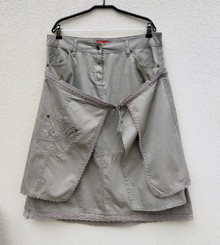Świetna spódnica z tkaniny bawełnianej w rozwodnionym jasnozielonym kolorze. Staranie uszyta z licznymi detalami . Trapezowy fason z nakładką z przodu zapinaną na pasek z klamerką - nakładka obszyta pasmanterią w kolorze tkaniny ( na zdjęciu wyszedł trochę jaśniejszy odcień), nakładka z jednego boku dwuwarstwowa zachodząca do połowy tyłu. W talii pasek ze szlufkami , z przodu dwie wpuszczane kieszenie i jedna naszywana na nakładce, z tyłu jedna naszywana. Zapinana z przodu na zamek. Dół obszyty bawełnianą koronka w kolorze tkaniny.