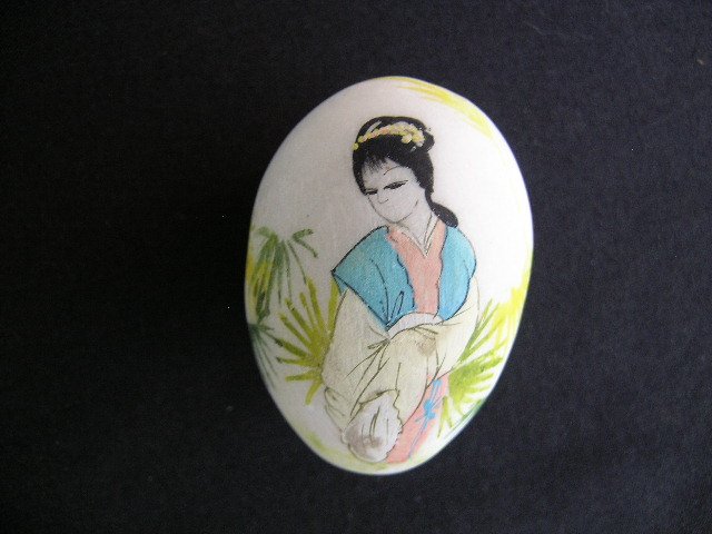 Wielkiej urody, orientalne, oryginalne i artystyczne, ręcznie malowane alabastrowe jajo dekoracyjne. Szlachetność, uroda i japońska elegancja. Subtelność wdzięcznego malunku i alabastrowość alabastru :) Ceniony przedmiot kolekcjonerski, każde jajo niepowtarzalne, rarytas z orientu. 7 x 4,5 x 5 cm. Stan zachowania bardzo dobry.