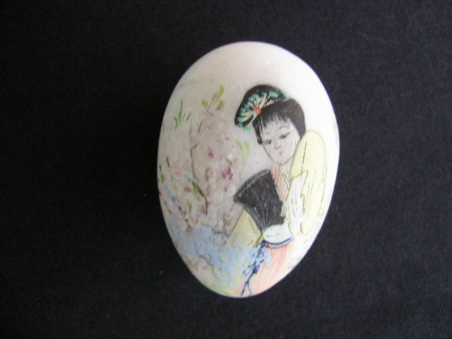 Wielkiej urody, orientalne, oryginalne i artystyczne, ręcznie malowane alabastrowe jajo dekoracyjne. Szlachetność, uroda i japońska elegancja. Subtelność wdzięcznego malunku i alabastrowość alabastru :) Ceniony przedmiot kolekcjonerski, każde jajo niepowtarzalne, rarytas z orientu. 7 x 4,5 x 5 cm. Stan zachowania bardzo dobry.