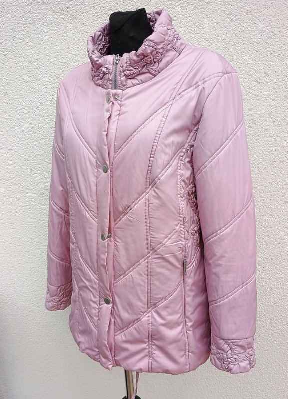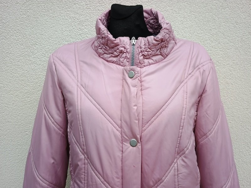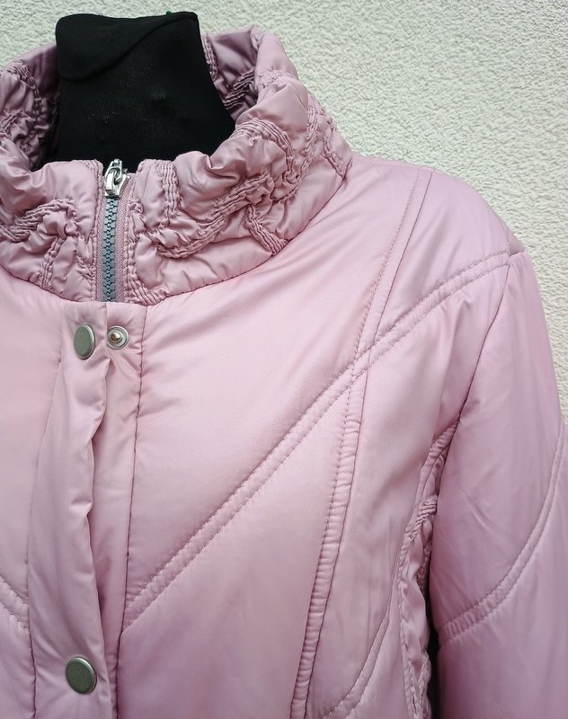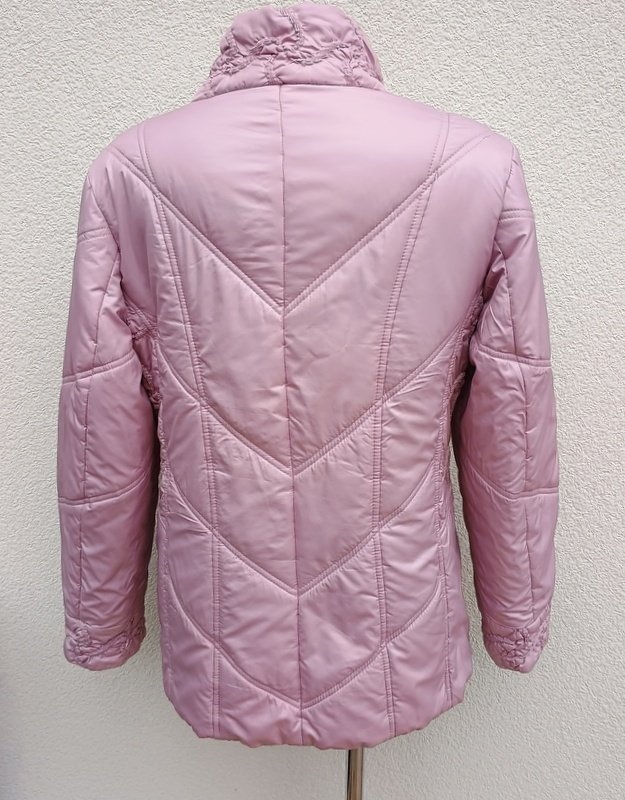 Świetna ocieplana pikowana kurtka z miłej mięciutkiej tkaniny poliestrowej w ładnym odcieniu wrzosowego koloru, miejscowo drapowana ( stójka , mankiety , boki kurtki). Ocieplenie sztuczne . Z kołnierzem stójką, z dwiema wpuszczanymi kieszeniami z zamkami, ściągana u dołu troczkami .Zapinana na zamek ukryty pod plisą zapinaną na napy. Całość na podszewce. Wygodna i bardzo lekka.