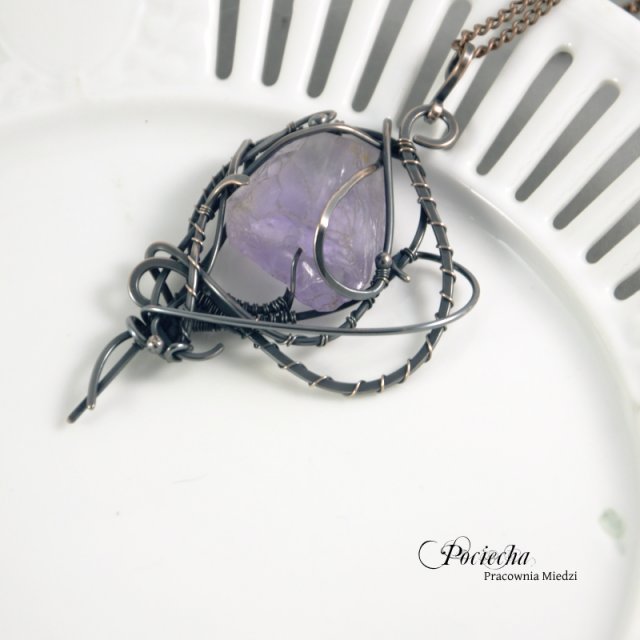 Naszyjnik z ciekawym wisiorem. Od podstaw stworzony ręcznie z miedzi. Centrum wisiora stanowi duży surowy kwarc w kolorze fioletu. Został on opleciony misternie miedzią. Wisior zawiesiłam na antyalergicznym łańcuszku. Zapięcie miedziane ręcznie kute.