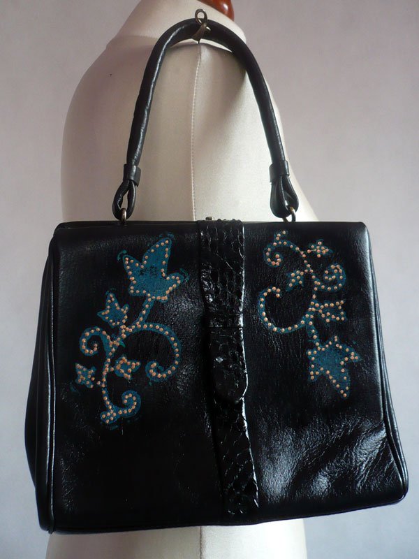 Retro torebeczka uszyta z naturalnej,czarnej skóry [przez środek pasek ze skóry węża].Pasek do ręki.Zapinana na ozdobny zatrzask. ozdobiona dekorami-polakierowana.Wew.czarna podszewka.1 komora z kieszonką.