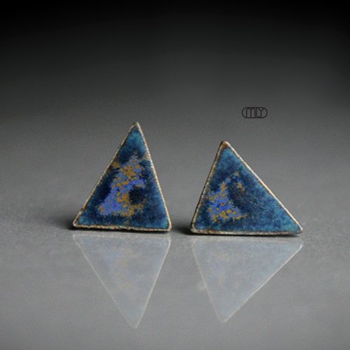 Ceramiczne kolczyki w formie sztyftów, ręcznie wykonane z delikatnej czekoladowobrązowej gliny kamionkowej, jednostronnie szkliwione mieszanką błekitnych szkliw z efektem plamek, na sztyftach w kolorze srebrnym. długość ok. 11mm. Polecam . Termin realizacji zamówienia to 1-2 dni.