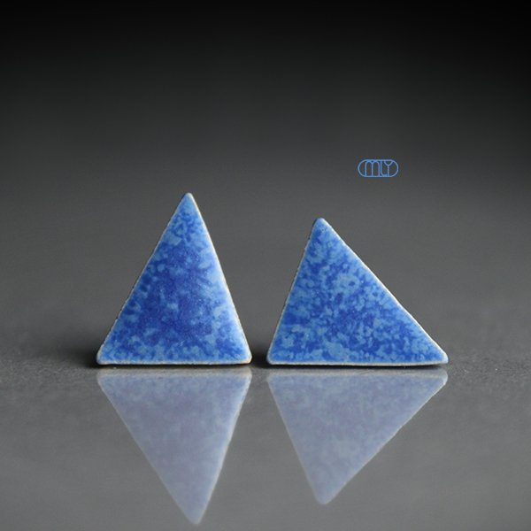 Ceramiczne kolczyki w formie sztyftów, ręcznie wykonane z delikatnej gliny kamionkowej, jednostronnie szkliwione mieszanką błekitnych szkliw z efektem plamek, na sztyftach w kolorze srebrnym. długość ok. 11mm. Polecam .