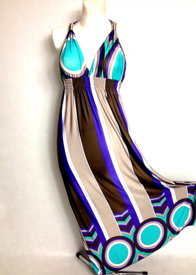 Ta sukienka po prostu skradła moje serce.. Prze-pię-kna maxi sukienka o fasonie rozkloszowanym, w optycznie wyszczuplające pionowe pasy w towarzystwie geomterycznych wzór, a wszystko to w ślicznych kolorach; turkusie, brązie, mokka, fiolet, biel. Przy ramiączkach metalowe okucia.