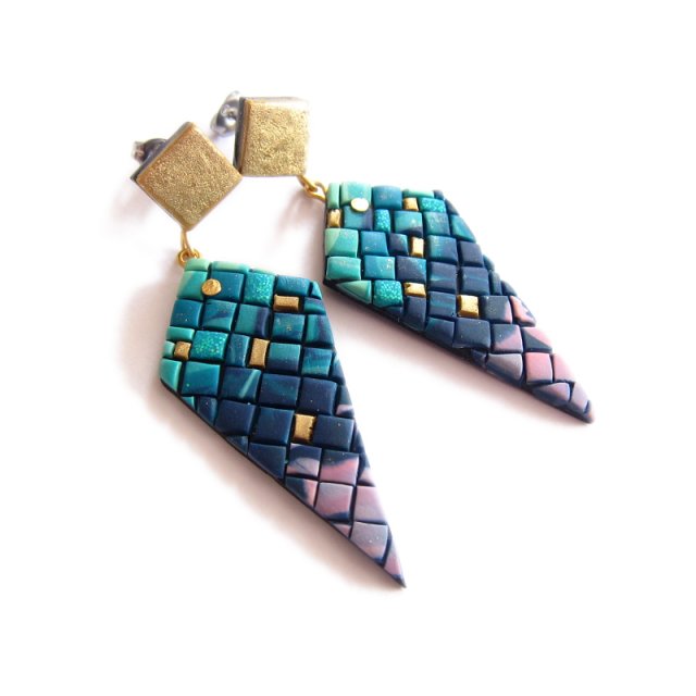 Nowoczesne awangardowe kolczyki wykonane w całości ręcznie z masy termoutwardzalnej Fimo w granatowych, morskich, różowych i złotych barwach oraz z wysokiej jakości sztyftów ze stali. Wielkość kolczyków to ok. 65 mm. Kolczyki są lekkie i bardzo solidnie zrobione.