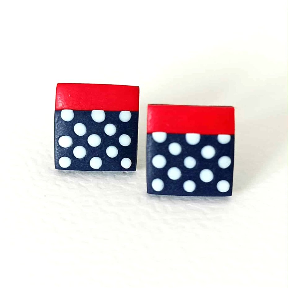 Geometryczne kolczyki wykonane ręcznie z masy termoutwardzalnej Fimo. Wielkość kolczyków to 12 mm. Sztyfty wykonane są ze stali chirurgicznej. Kolczyki świetne na prezent.
