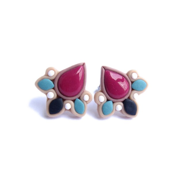 Nowoczesne awangardowe kolczyki wykonane w całości ręcznie z masy termoutwardzalnej Fimo oraz z wysokiej jakości sztyftów ze stali. Wielkość kolczyków to ok. 16 mm. Kolczyki są lekkie i bardzo solidnie zrobione.