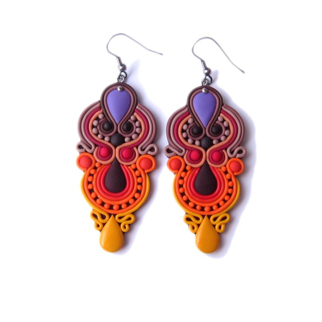 Nowoczesne awangardowe kolczyki wykonane w całości ręcznie z masy termoutwardzalnej Fimo w barwach zachodzacego słońca oraz z wysokiej jakości bigli ze stali. Wielkość kolczyków to ok. 6 cm (8 cm z biglami). Kolczyki są lekkie i bardzo solidnie zrobione.