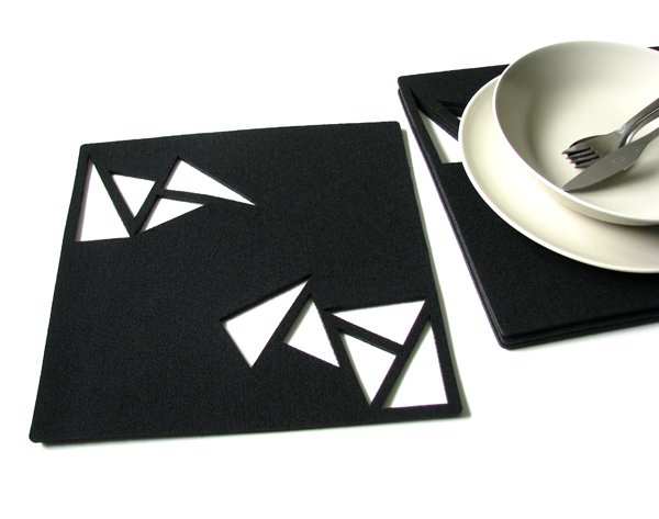 Zestaw czterech kwadratowych podkładek pod talerze. Wycięte laserowo w czarnym filcu 4mm, spodnia strona lekko impregnowana, co dodatkowo chroni stół przed zniszczeniem. Wzór prosty, geometryczny, pięknie komponuje się z nowoczesnymi wnętrzami.
