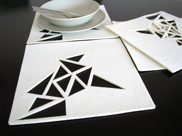 Zestaw czterech kwadratowych podkładek pod talerze. Wycięte laserowo w białym filcu 4mm, spodnia strona lekko impregnowana, co dodatkowo chroni stół przed zniszczeniem. Wzór prosty, geometryczny, pięknie komponuje się z nowoczesnymi wnętrzami.