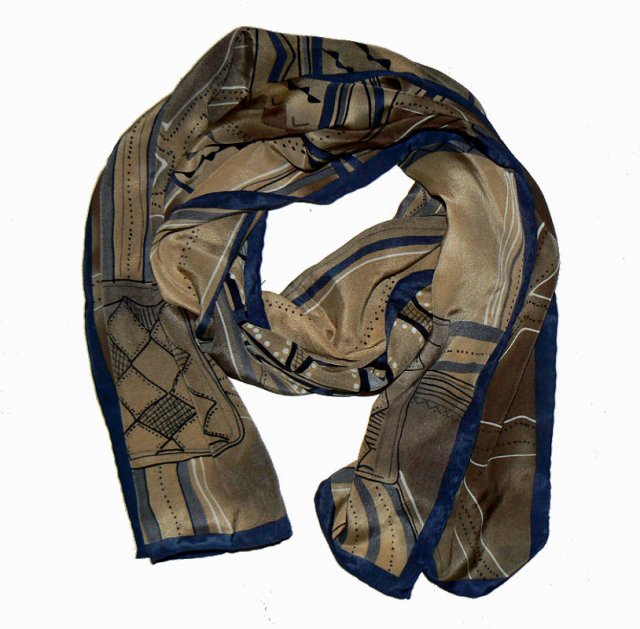 Szal w odcieniach brązu i granatu w geometryczne wzory. Rolowane brzegi. Materiał lekko lejący, świetnie się układa.
