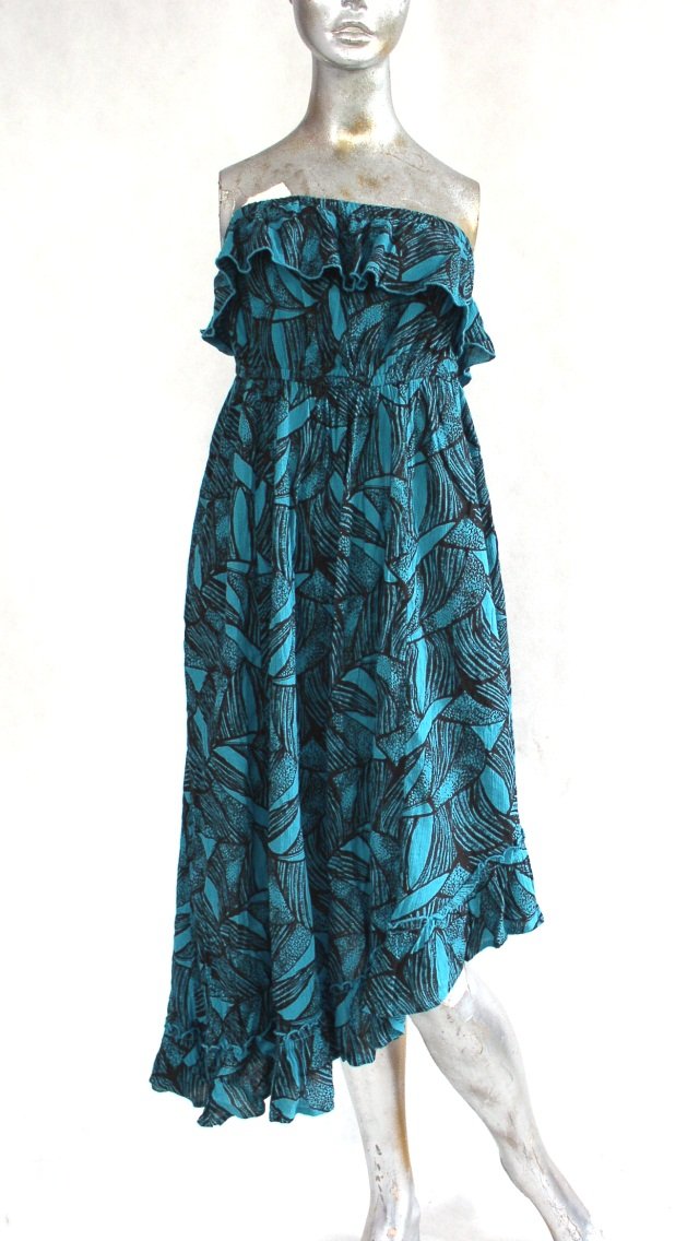 Sukienka firmy George.Rozmiar 44.Materiał bawełna lekko kreszowana.Bez ramiączek,góra ściągana gumą+falbana.Odcięta w pasie+gumka.Dół z lewego boku krótszy,wykończony falbaną,Stan bardzo dobry.Długość krótszego boku 76 cm.dłuższy 106 cm.Góra na płasko 80 cm.