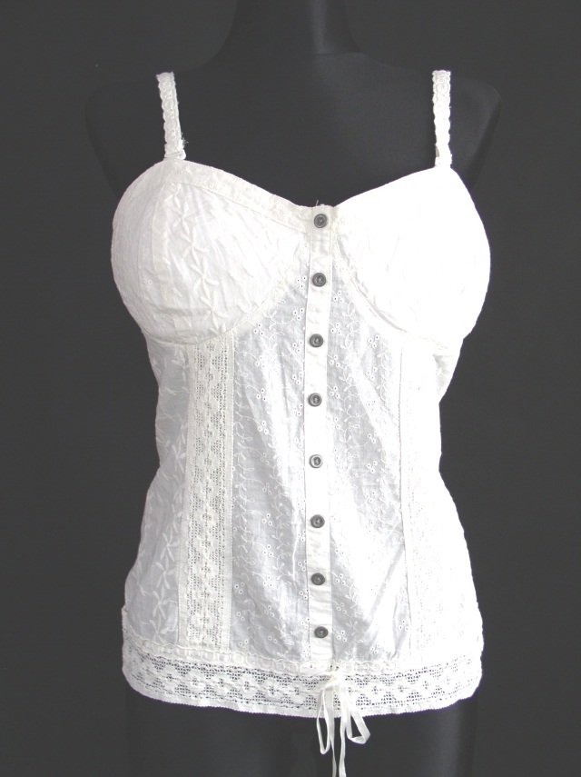 Bluzka-gorset firmy George.Rozmiar 44.Materiał bawełna.Ramiączka regulowane,odpinane.Staniczek z wkładką z gąbki.Z przodu taśma z szarymi guziczkami.Materiał haftowany+naszyte bawełniane taśmy.Dół przodu zakończony taśma+wiązanie z taśmy z lekkim połyskiem.Tył na środku ściągany wstawką gumkowaną.Stan bardzo dobry-.Długość mierzona z boku 39 cm.pod pachami 106 cm.bez rozciągania.