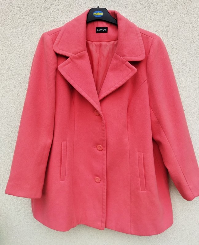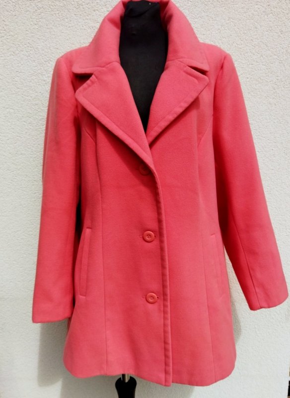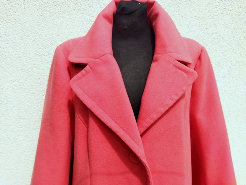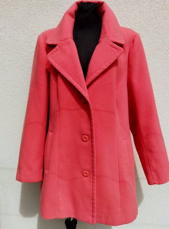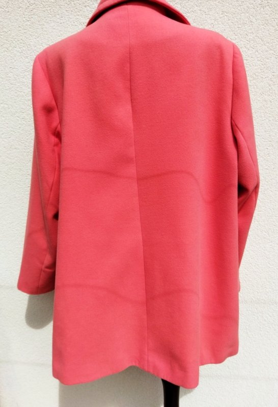 Kurtka z flauszowej tkaniny w ciepłym różowo-pomarańczowym kolorze ( nie jaskrawym ). Z kołnierzem z rewersami, z dwiema wpuszczanymi kieszeniami. zapinana na trzy guziki. Całość na podszewce.