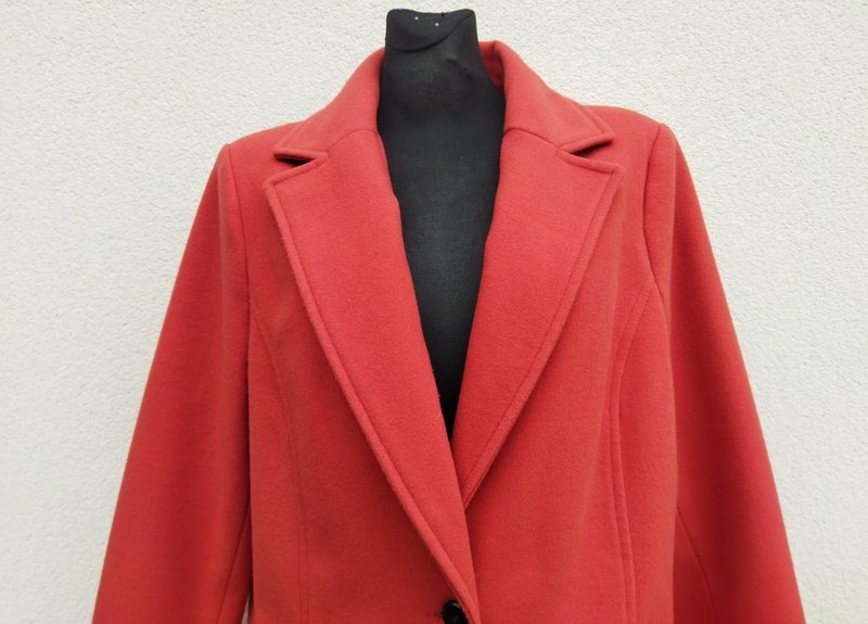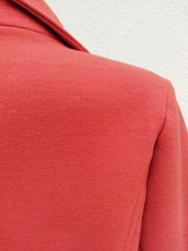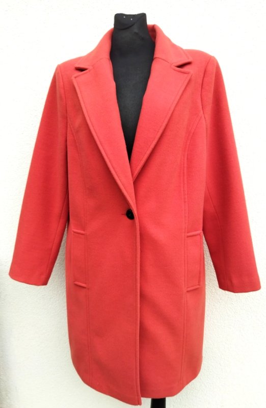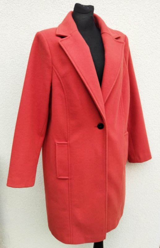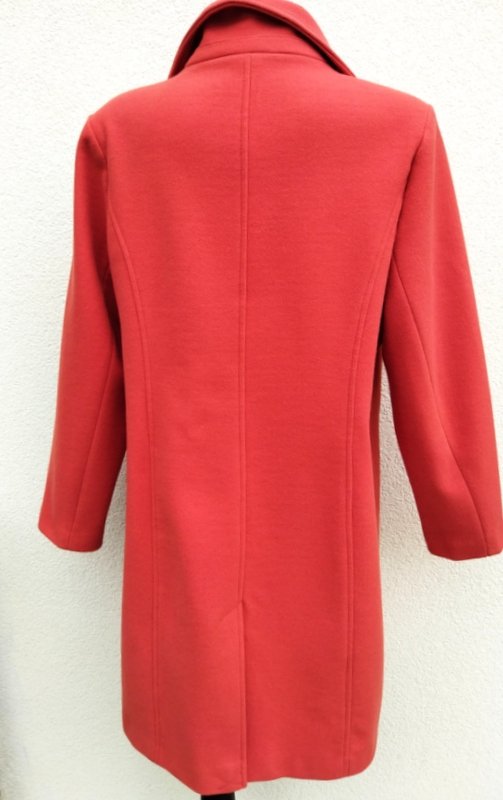 Zgrabny płaszcz z flauszowej tkaniny poliestrowej w rudo-pomarańczowym kolorze. Lekko taliowany , z kołnierzem z rewersami z dwiema wpuszczanymi kieszeniami, z krytym rozcięciem z tyłu u dołu. Całość na podszewce. Dobrze leży