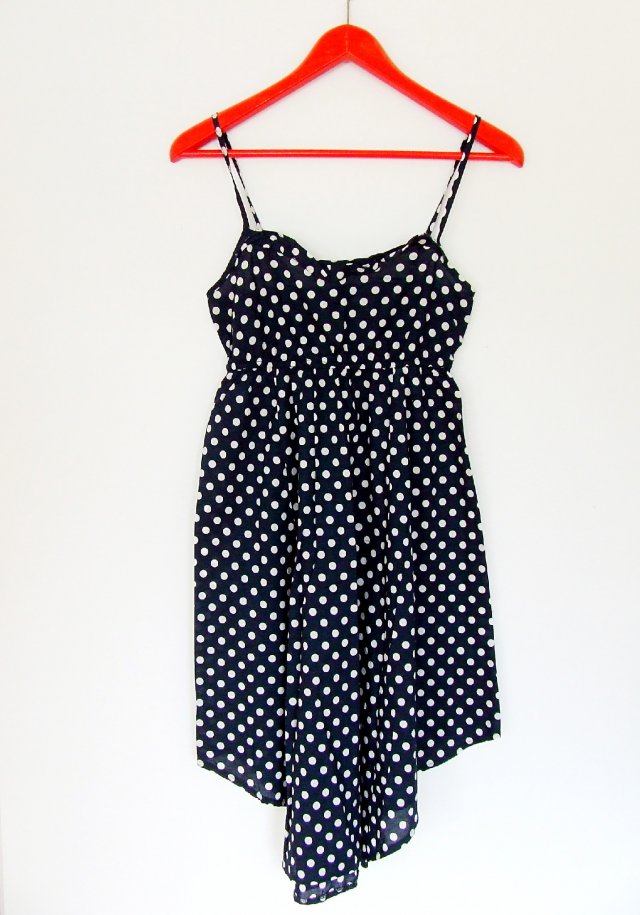 Granatowa sukienka w białe grochy, na regulowanych ramiączkach, odcinana pod biustem, w odcięciu elastyczna gumka, która się dopasowuje do sylwetki. Przód oraz tył sukienki są dłuższe. Sukienka idealna na lato, lekka i przewiewna, bez podszewki.