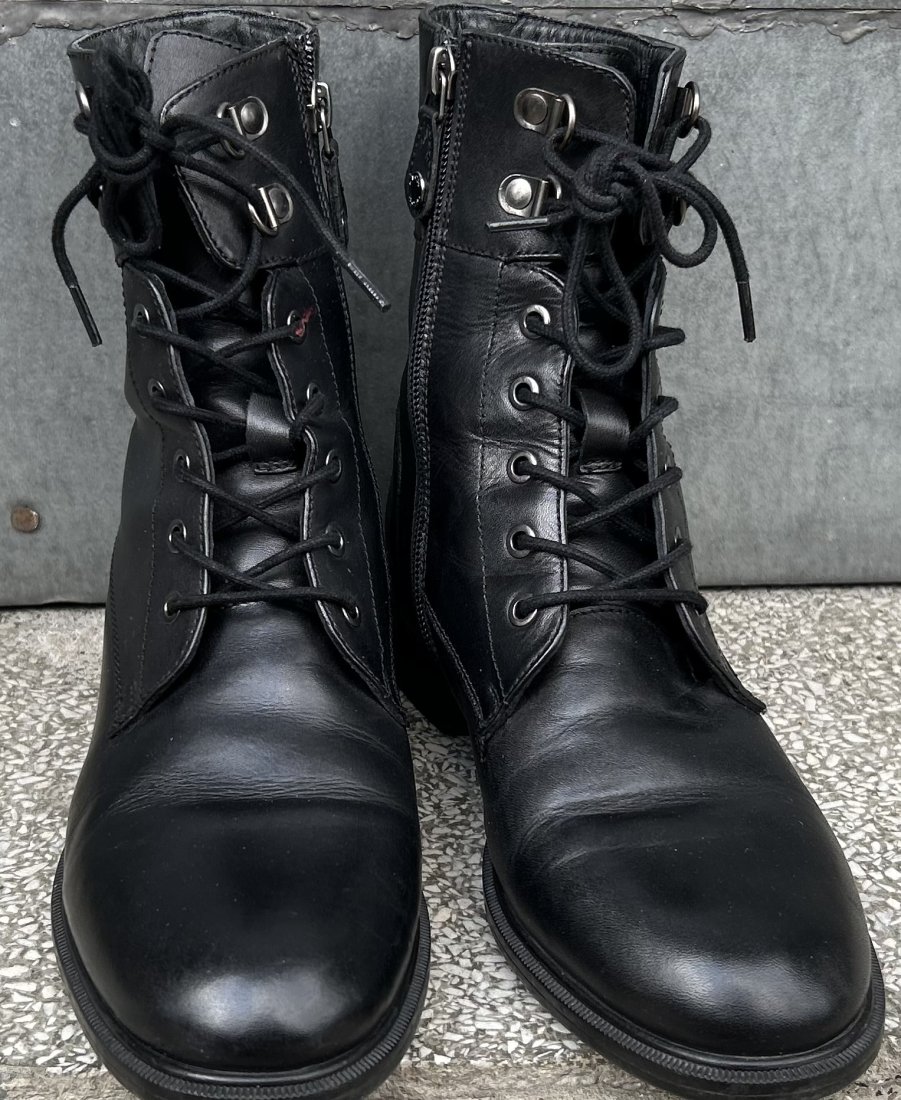 Geox Italian Patent - Rozmiar 37/37,5 - na szczupłą stopę . Stabilne, skórzane ( skóra naturalna ) stylowe botki. Wysokość obcasa 3 cm . Wysokość cholewki mierzona od spodu do góry 20 cm podeszwa : długość 26 szerokość ciut ponad 9 cm . Wiązanie w kostce na ciasno to 11 cm . Jest duża regulacja . firma Geox robi bardzo piękne i dobrze wykonane buty :) Porządne wykonanie : wewnątrz skórzana wkładka z napisami firmowymi : część Geox i Italian patent jest czytelna ( jest też od spodu na podeszwie ) reszta niestety nie . ) Na szczupłe stopy . Stan zachowania bardzo dobry Minimalne ślady użytkowania .