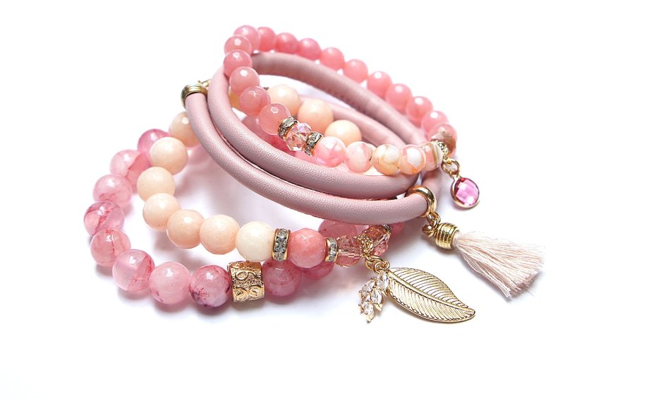 Komplet czterech bransoletek wykonanych z naturalnych kamieni - jadeity fasetowane [8mm i 10mm], jadeity szkliste [10mm], kryształki fasetowane [8mm], masa perłowa [8mm], rzemienia z ekologicznej skóry [śr. 5mm], chwostu, zawieszki wysadzanej cyrkoniami, zawieszki ze szkła w okuciu oraz elementów metalowych w kolorze złotym. Bransoletki pasują na nadgarstek 15,5 - 16,7cm.