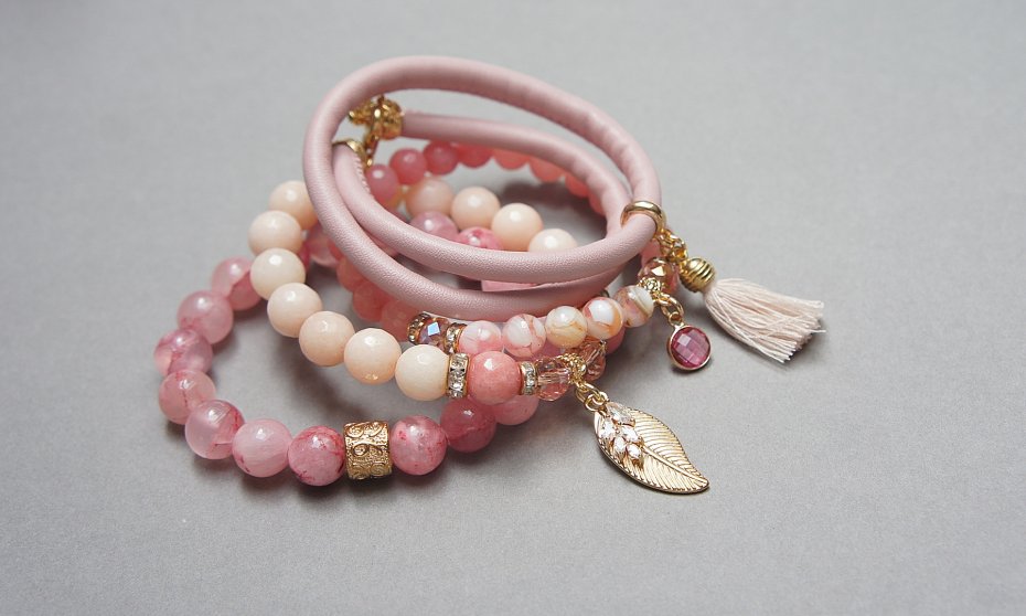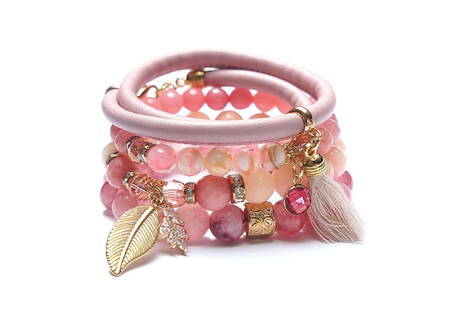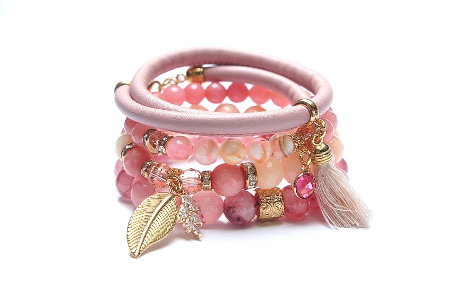 Komplet czterech bransoletek wykonanych z naturalnych kamieni - jadeity fasetowane [8mm i 10mm], jadeity szkliste [10mm], kryształki fasetowane [8mm], masa perłowa [8mm], rzemienia z ekologicznej skóry [śr. 5mm], chwostu, zawieszki wysadzanej cyrkoniami, zawieszki ze szkła w okuciu oraz elementów metalowych w kolorze złotym. Bransoletki pasują na nadgarstek 15,5 - 16,7cm.