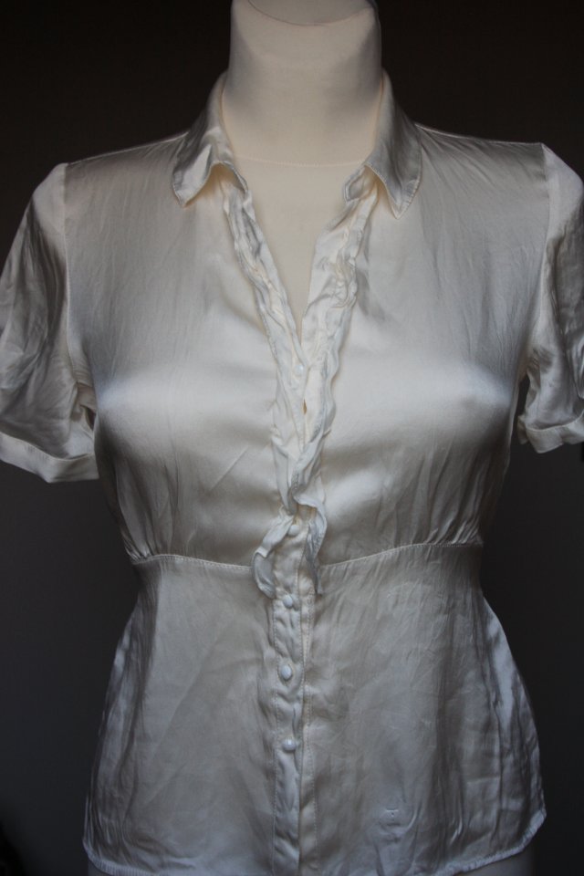 jedwabna biała elegancka krótka biała bluzka zapinana na guziki, przy guzikach ozdobne falbanki, z kołnierzykiem, krótkie rękawki zapinane na guzik, z tyłu wiązana