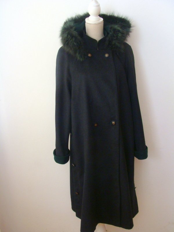 Piękny świetnej jakości wełniany płaszcz z kaszmirem w czarnym kolorze z ciemnozielonymi dodatkami: mankiety rękawów, lamówki, wnętrze kaptura, wewnętrzne podszycia. doskonale odszyty i wykończony. Z kapturem obszytym naturalnym futerkiem z zielonym zabarwieniem końcówek. Fason trapezowy z raglanowymi rękawami z dwiema wpuszczanymi kieszeniami. Zapięcie dwurzędowe na oryginalne guziki, po bokach płaszcza imitacja zapięcia: plisy z ciemnozielonymi lamówkami z naszywanymi guzikami. Całość na podszewce. Bardzo lekki.