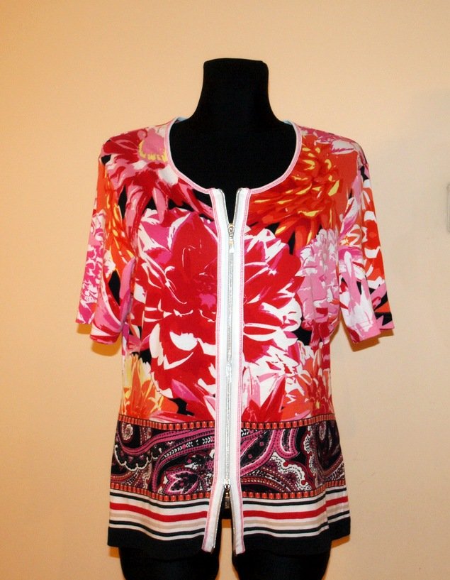Bluzka marki Gerry Weber. Materiał prawdopodobnie 100% cienka dzianina bawełniana. Stan bardzo dobry, jak nieużywana. Zasuwana z przodu na podwójny zamek. Brak metki z rozmiarem, ale myślę, że to 42-44.