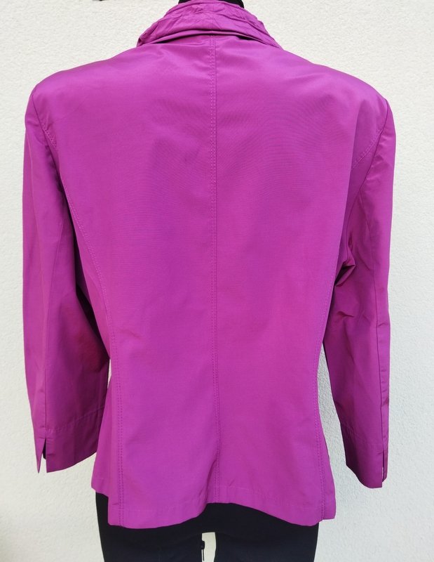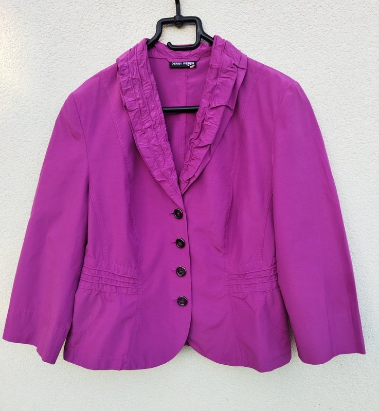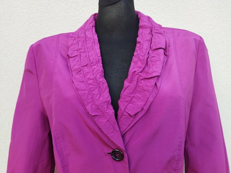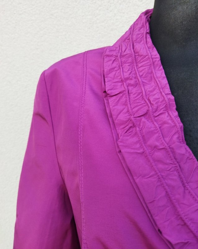 Ciekawa , elegancka marynarka  w  odcieniu ciemniejszego  zgaszonego  różu ( pałacowy róż) , na zdjęciu wyszedł kolor  fuksji . taliowana z ozdobnym kołnierzem i drobniutkimi szczypankami po bokach. Taliowana  z rozcinanymi mankietami rękawów. Zapinana na cztery guziki. Bez podszewki.