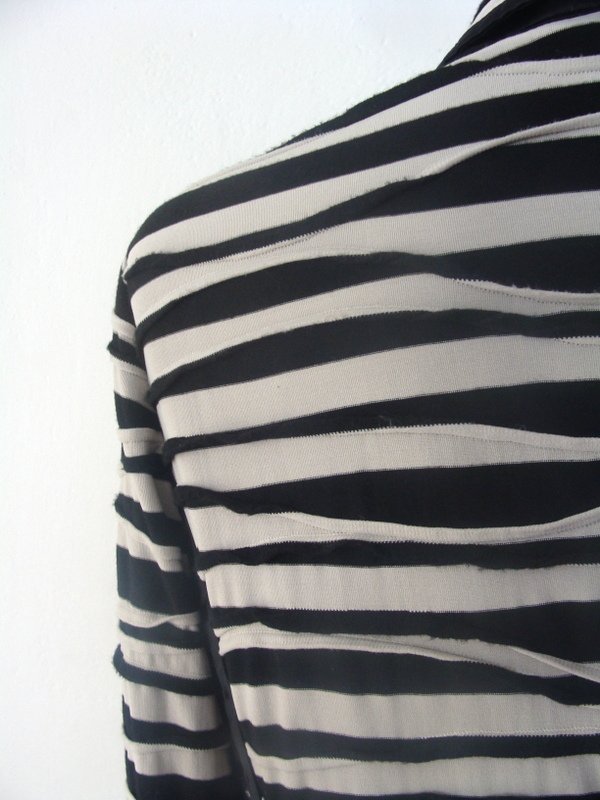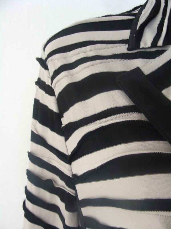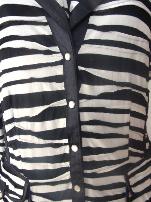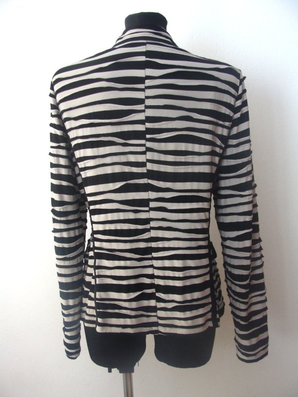 Letnia zgrabna marynarka z dzianinowej tkaniny z faktura ciętych mini falbanek , w nieregularne paski w kolorystyce piaskowego beżu i czerni, wykończona czarnymi lamówkami. Taliowana , zapinana na ozdobne napowe guziki , z kołnierzem z rewersami , z dwiema naszywanymi kieszeniami z patkami zapinanymi na ozdobny napowy guzik. Podszewka w rękawach i w części pleców. Miła podatna i rozciagliwa.