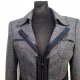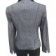 Zgrabna marynarka z a' la tweedowej tkaniny z przewaga wełny i jedwabiu w składzie w kolorystyce sól i pieprz . taliowana z kołnierzem z rewersami, z czterema kieszeniami ; dwie naszywane u góry i dwie wpuszczane z rozsuwanymi zamkami u dołu marynarki, stębnowana czarnymi nićmi , wybrane elementy zdobione czarnymi obszyciami z poliestrowych tkanin: błyszczącej i transparentnej. Zapinana na zamek. całość na podszewce
