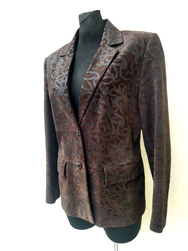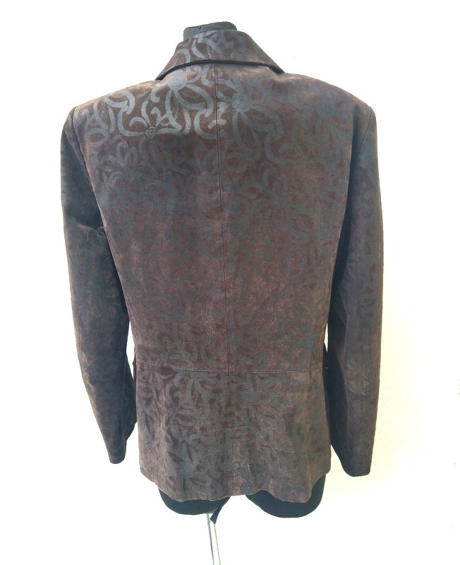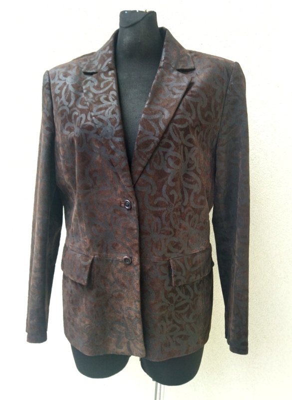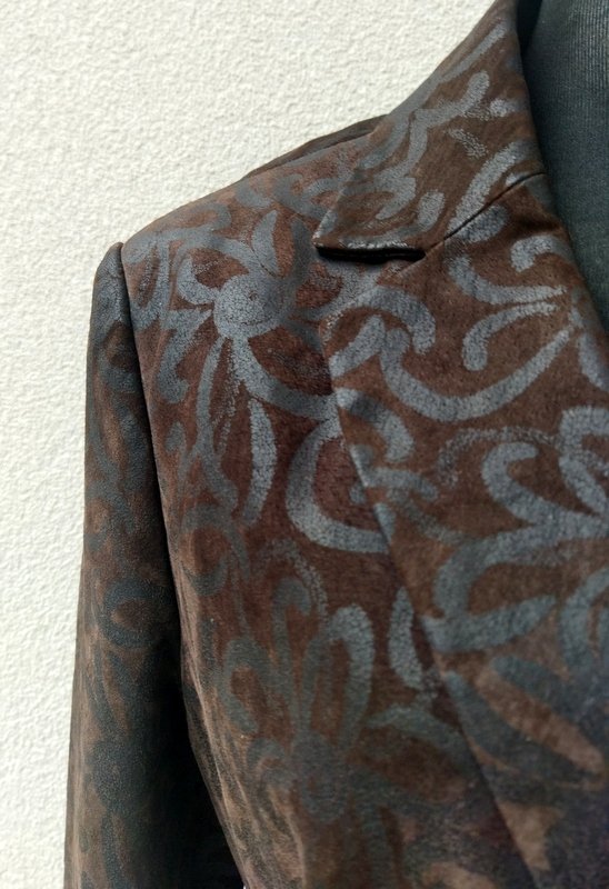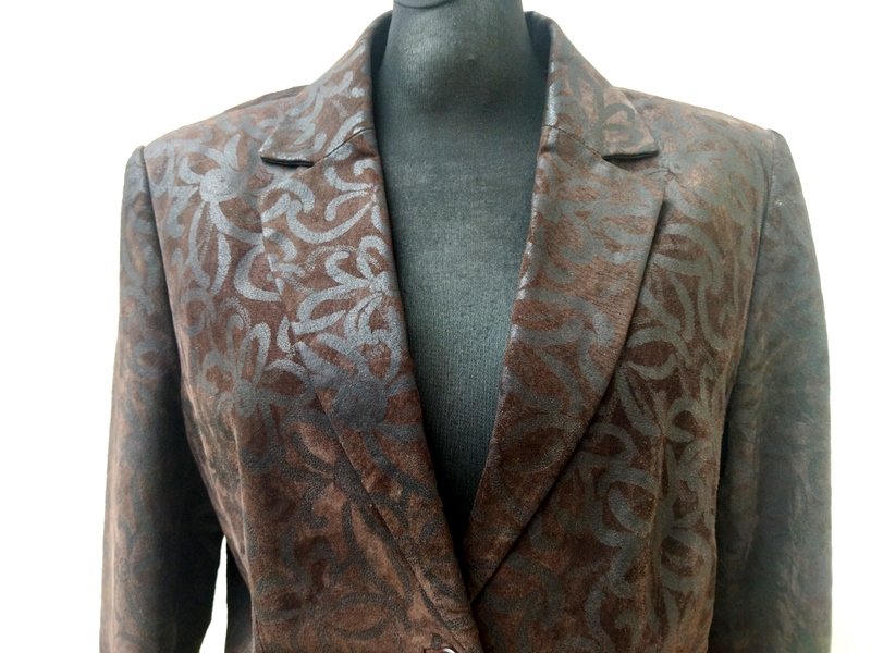 Marynarka lub kurtka z zamszowej skóry naturalnej w kolorze gorzkiej czekolady z malowanym wzorem w tym samym kolorze. Z kołnierzem z rewersami, z dwiema wpuszczanymi kieszeniami z patkami. zapinana na guziki. Na podszewce.