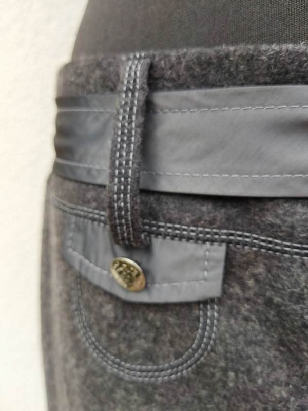 Zgrabna , dobrej jakości trapezowa spódnica najprawdopodobniej z wełnianej tkaniny w melanżowej grafitowej czerni. Szyta z łączonych nieregularnych klinów stębnowanych nieco jaśniejszą nicią. W talii szerszy pasek z naszywanymi szlufkami i przeciąganym przez klamerki paskiem z lekko błyszczącej tkaniny oraz imitacją małej kieszonki z patką z guzikiem. Zapinana z boku na zamek. Na podszewce .