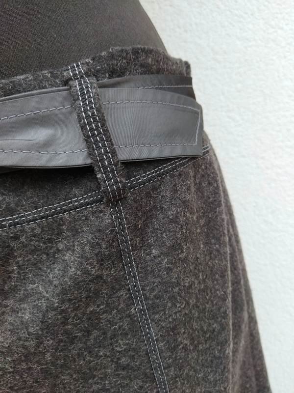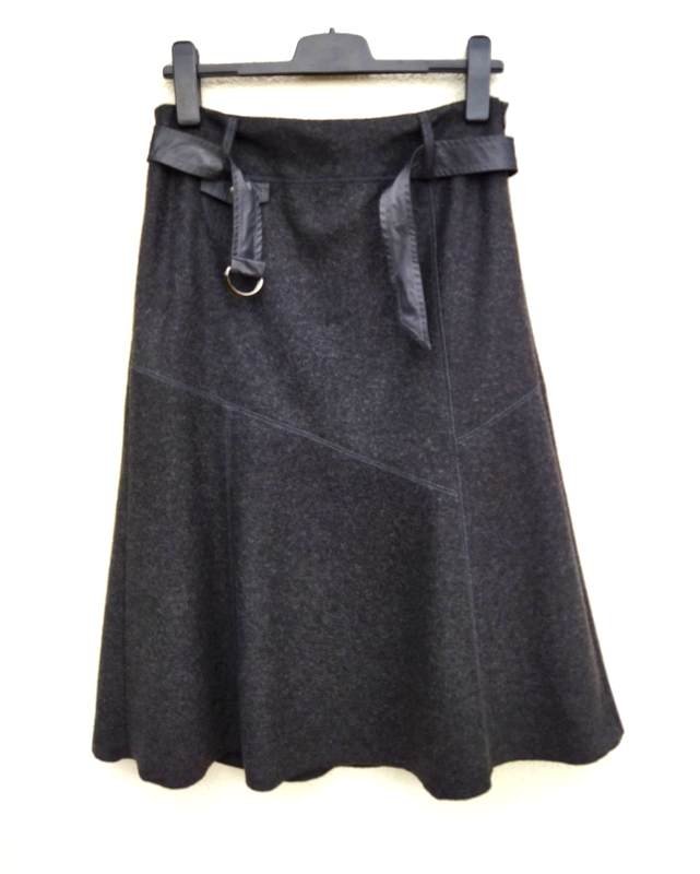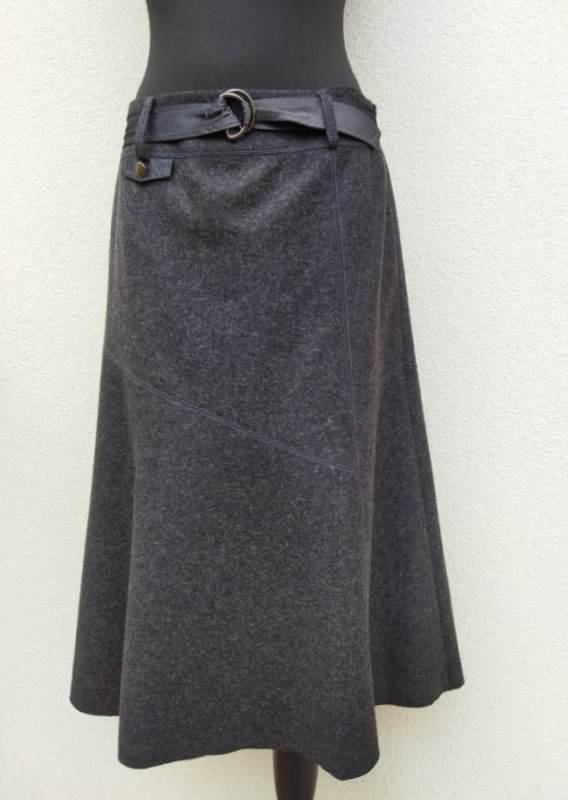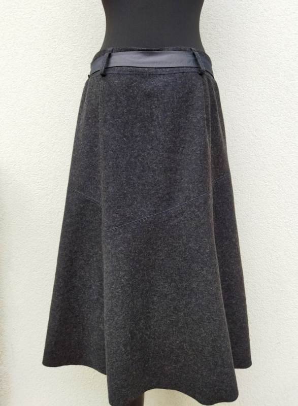 Zgrabna , dobrej jakości trapezowa spódnica najprawdopodobniej z wełnianej tkaniny w melanżowej grafitowej czerni. Szyta z łączonych nieregularnych klinów stębnowanych nieco jaśniejszą nicią. W talii szerszy pasek z naszywanymi szlufkami i przeciąganym przez klamerki paskiem z lekko błyszczącej tkaniny oraz imitacją małej kieszonki z patką z guzikiem. Zapinana z boku na zamek. Na podszewce .