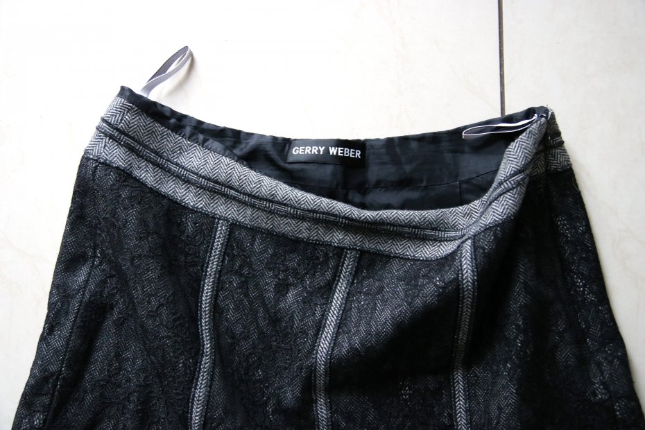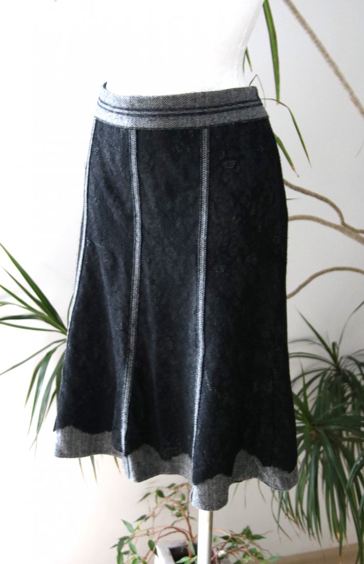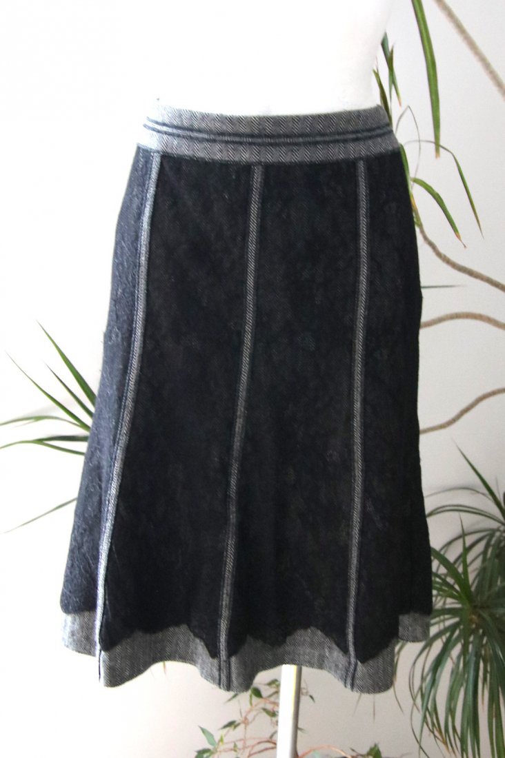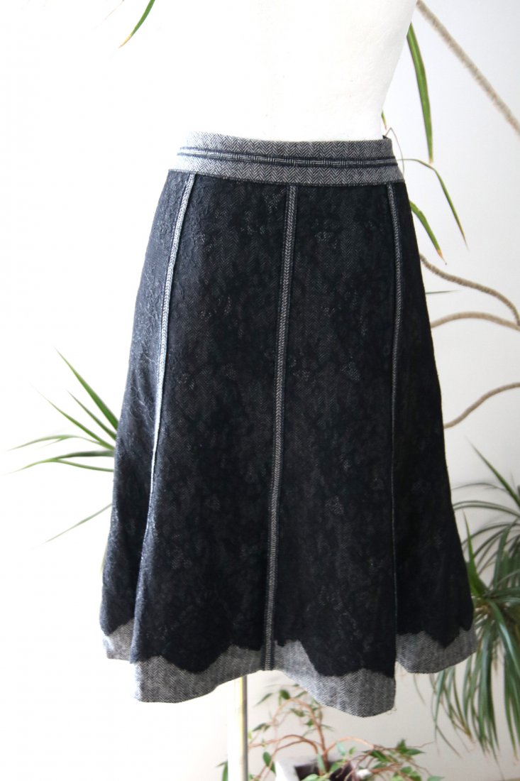 szara spódnica z wełny, uszyta z klinów, naszyta koronka, zapinana na zamek z boku, podszewka.